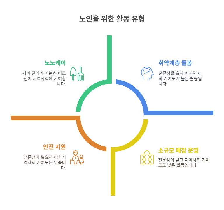 - 공익활동형: 지역사회 공익 증진을 위한 활동(월 30시간 활동, 27만 원 활동비)