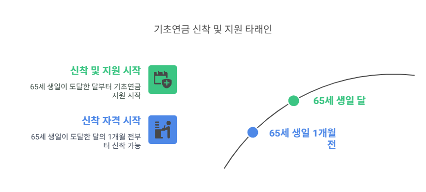 65세 생일이 속한 달의 1개월 전부터 신청 가능하며, 신청한 달부터 지급됩니다. 소득과 재산에 변동이 있을 경우 반드시 신고해야 추후 환수 조치를 피할 수 있습니다.